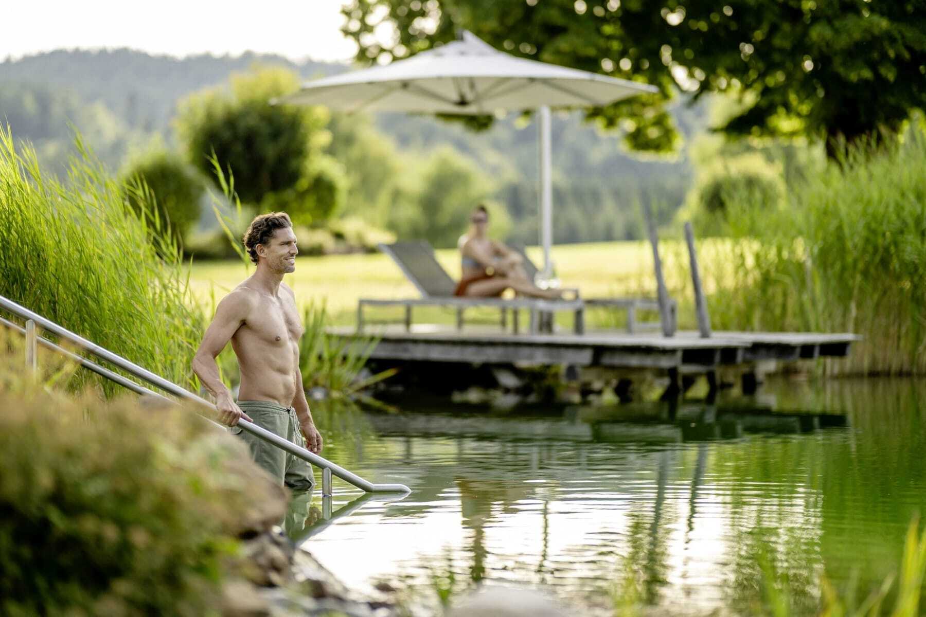 Ich bin etwas unschlüssig, wie ich den Morgen im Hotel Mooshof beginne – ganz ruhig im beheizten Außenpool, wenn alles noch still und nur Vogelgesang zu hören ist, beim flotten Aqua Fit im Indoorschwimmbad oder vielleicht mutig im kühlen Bergquellwasser des Naturbadeteichs? Ich entscheide mich für die Action mit dem Trainer am Beckenrand. Schließlich kann alles andere im Laufe des Urlaubstages nachgeholt werden. Danach ein schneller Early Bird-Kaffee im Poolbistro und dann auf in den Wellnesstag!