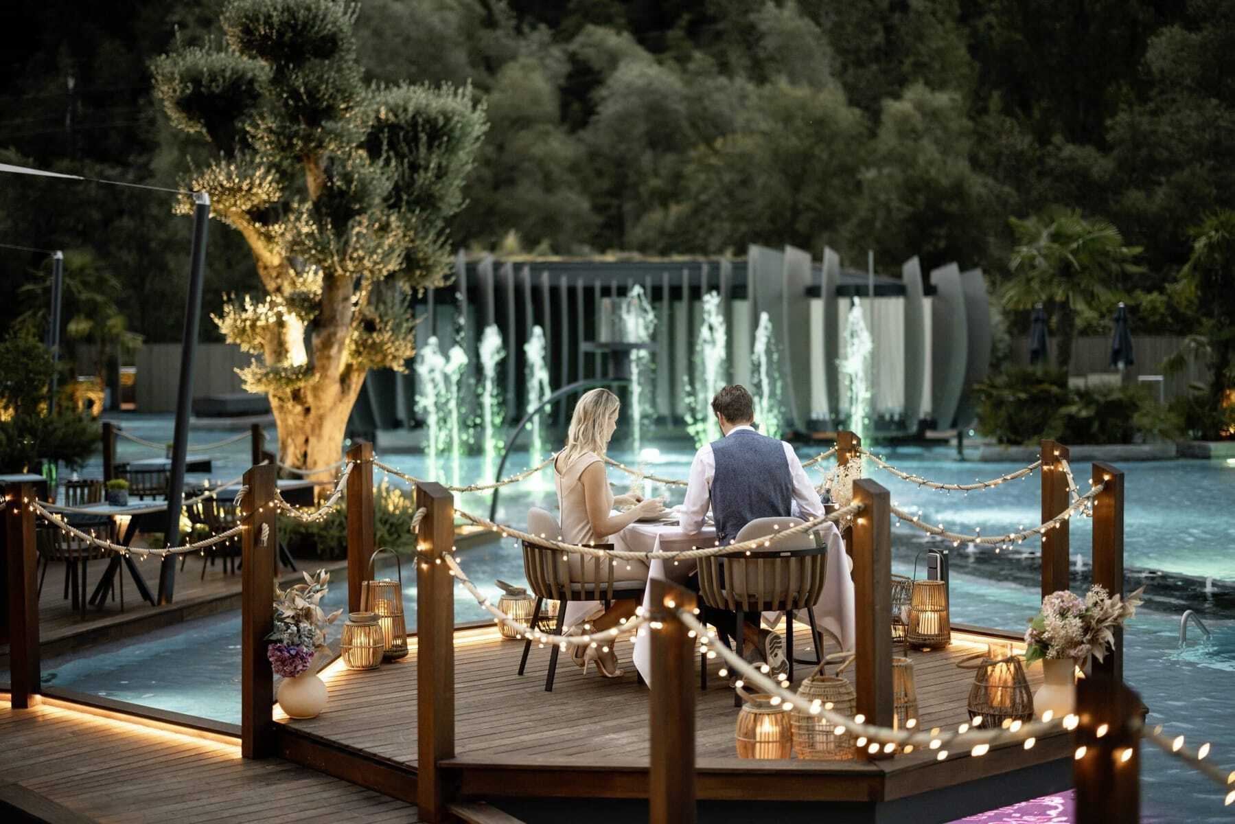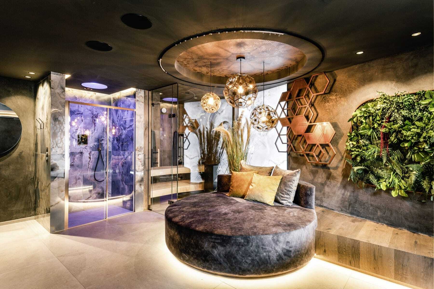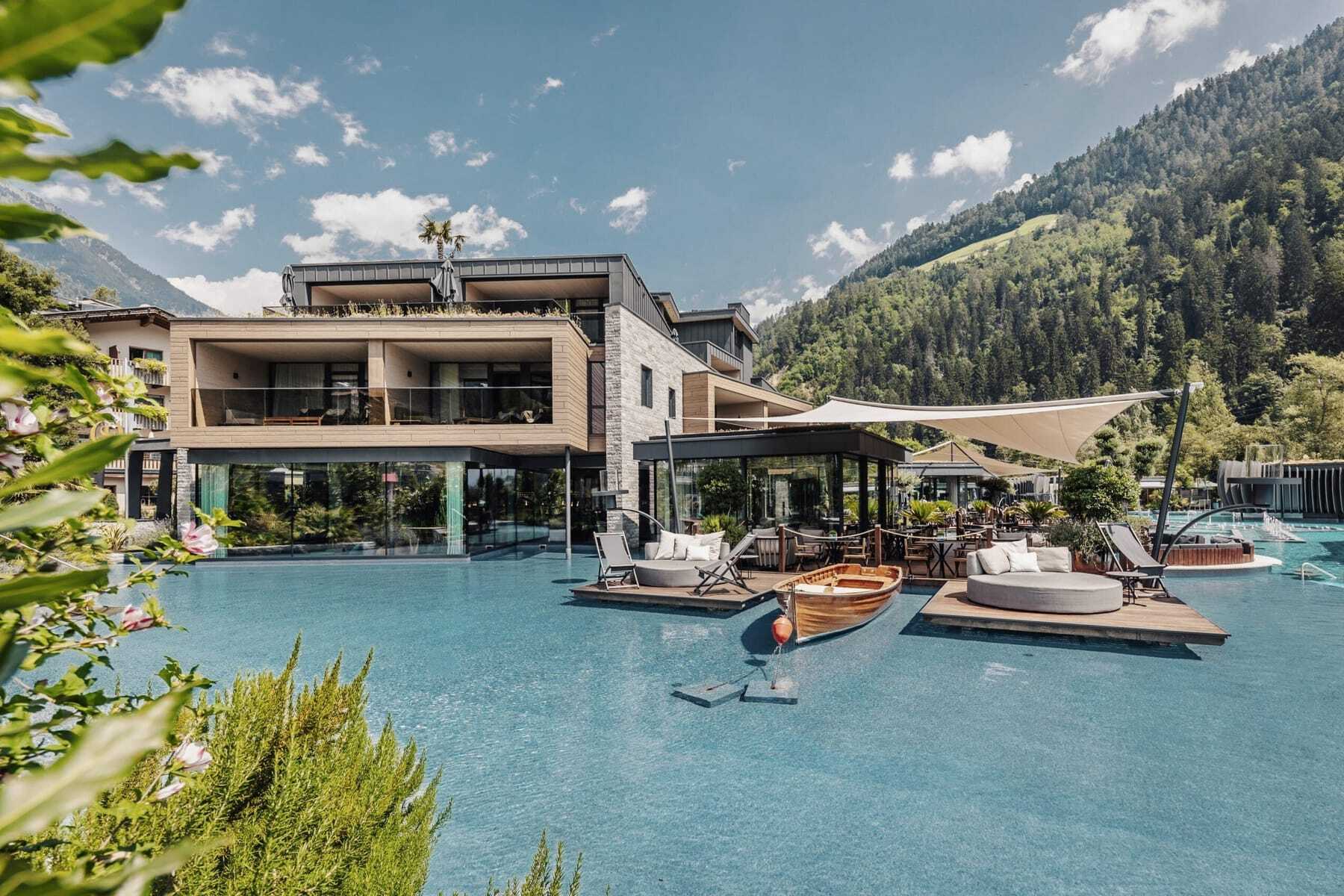 Nur 26 Einheiten bietet das 2022 eröffnete Resort, wie Inseln in den 4.500 qm großen, künstlichen See hineingebaut – den größten Pool Südtirols! – und umsäumt von tropischen Pflanzen. Wasser, das übrigens aus einer eigenen Quelle stammt, spielt in der See Lodge die Hauptrolle – auch unterirdisch, im Tauchschacht des Sees oder im »Underwater Restaurant«.