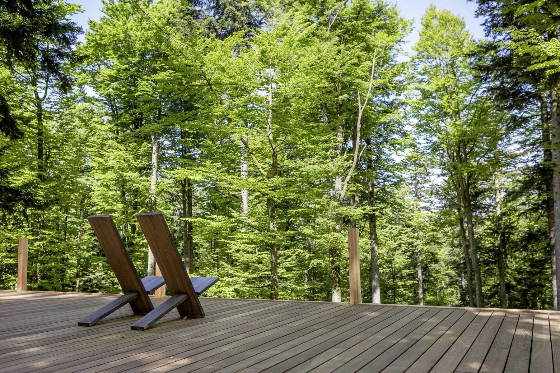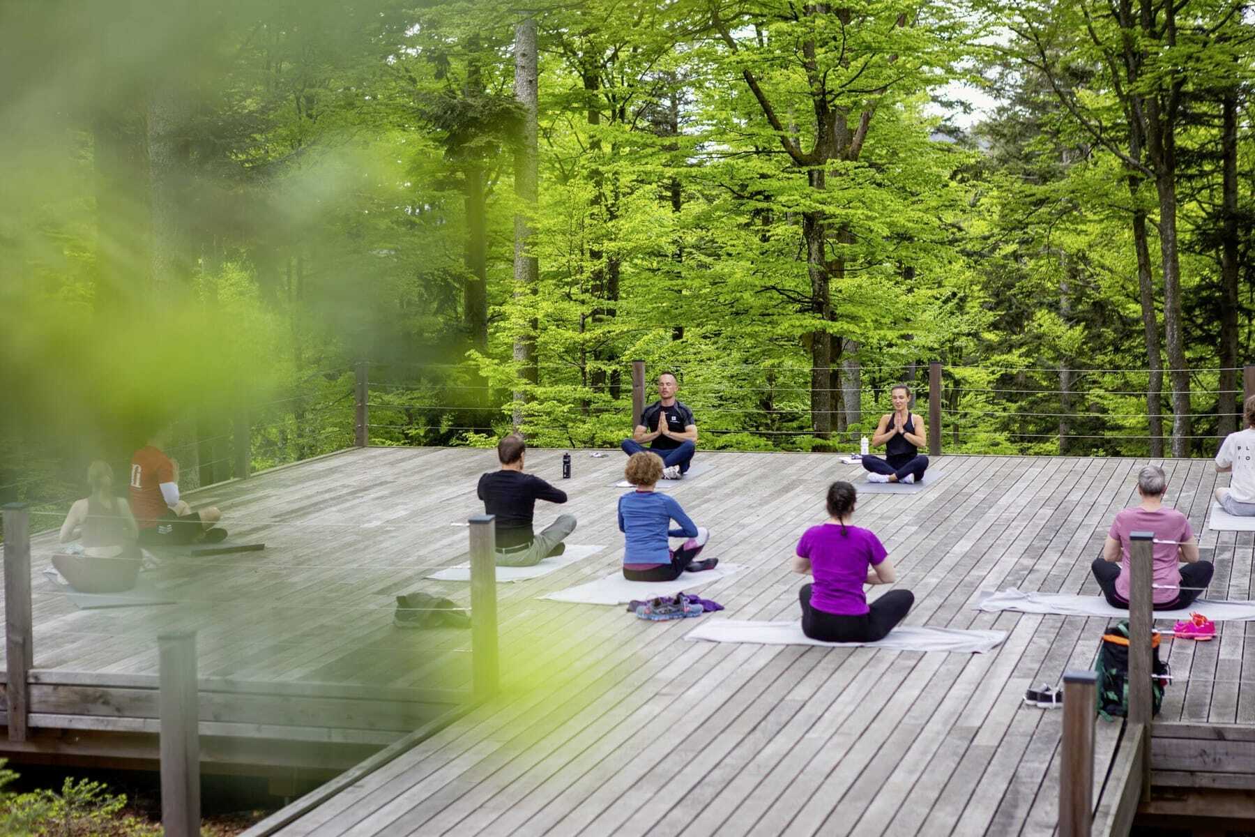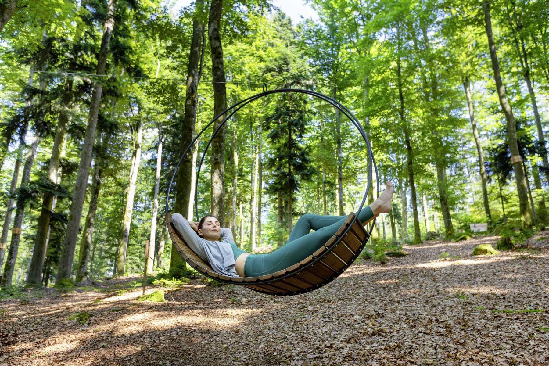 Nein, das ist keine Fata Morgana: Wer morgens aus seinem Zimmerfenster im Reischlhof blickt oder vielleicht im Outdoorpool erste Runden dreht, sieht oftmals den einen oder anderen Gast – manchmal im Bademantel – aus dem Hotel kommen, den Hang gegenüber hinauf laufen und im Wald verschwinden… Dort, wo sich das WaldSpa befindet. Das 40.000 qm große hoteleigene Gelände ist ein spiritueller Ort und in dieser Art absolut einzigartig. Mit Yoga-Plattform und mit Liegen und schaukelnden Hängematten. Manche treffen sich dort zum Sonnengruß, manche lassen sich und ihre Seele einfach baumeln, in kühler Bayerwaldluft, umgeben von Stille, die nur vom Blätterrauschen und Vogelgezwitscher unterbrochen wird. Tiefenentspannung par excellence.