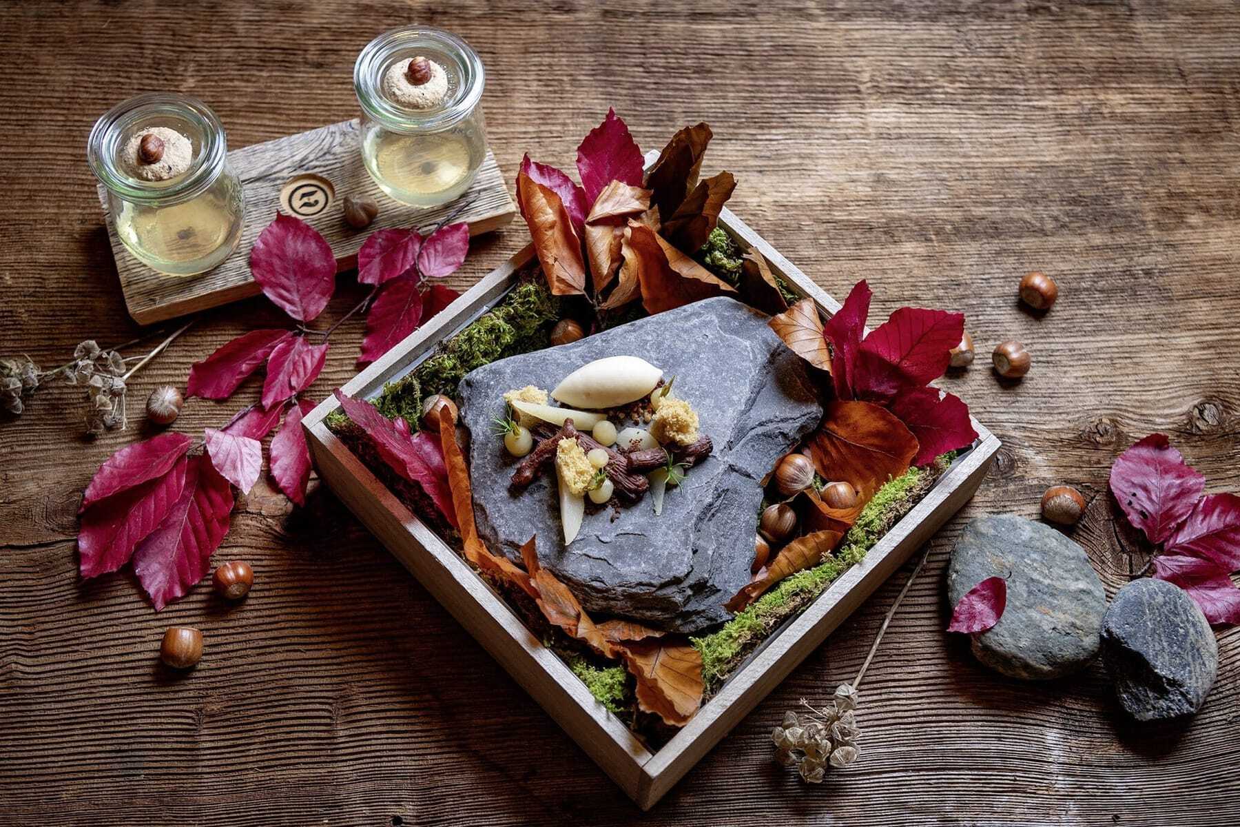 Für Letztere ist Inhaber und Küchenchef Patrizio Salzano verantwortlich. Er verwendet bevorzugt naturbelassene, meist regionale Produkte und Kräuter aus dem eigenen Garten, verarbeitet sie aufwendig nach alten Zubereitungsmethoden wie Beizen, Räuchern und Verkohlen und serviert das Ganze auf Naturstein, Holz oder Steingut. Und on top dekoriert er sie kunstvoll mit Moos und Tannenzapfen, mitten aus dem Wald.