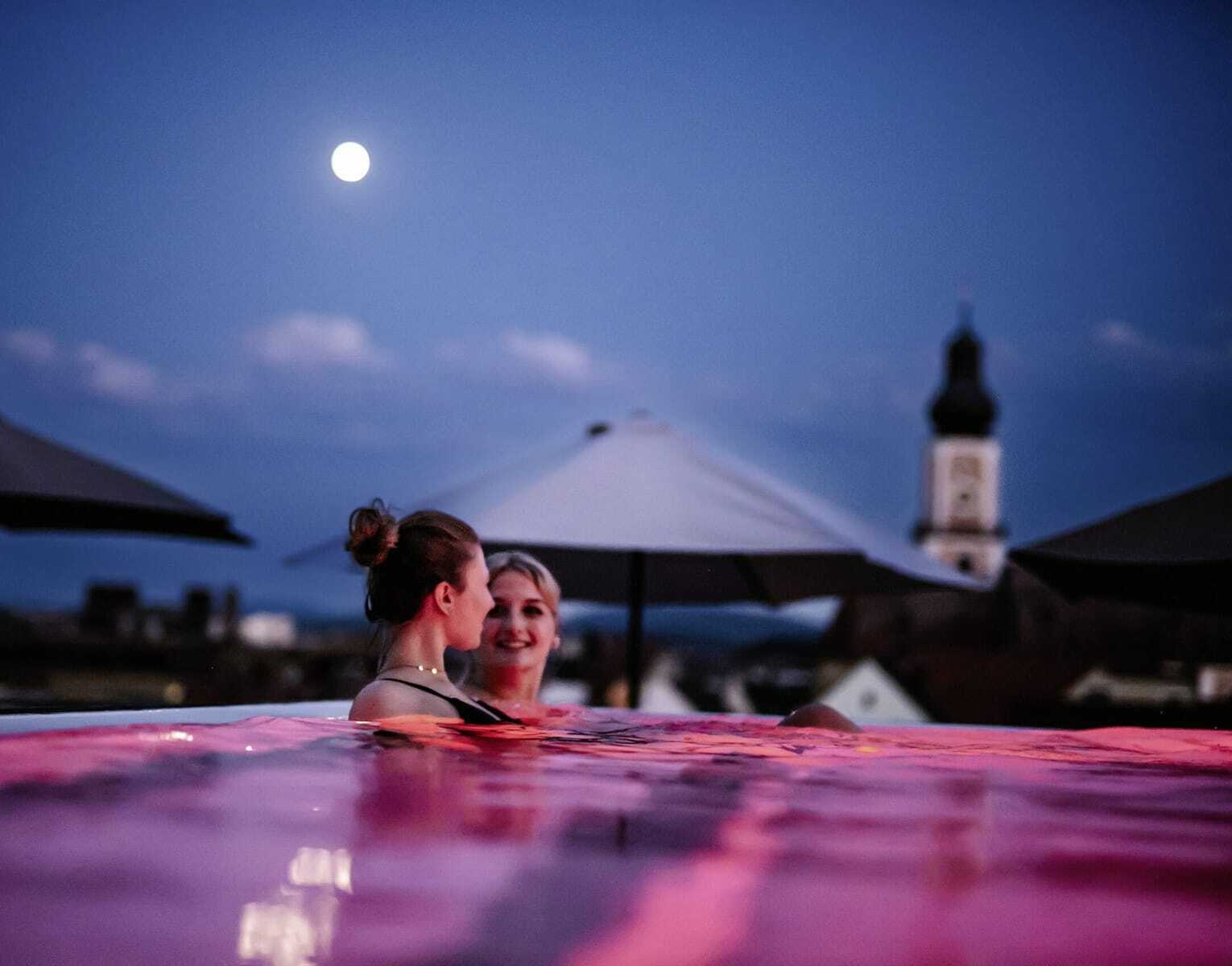 Manchmal bringt eine Verspätung auch etwas Gutes mit sich. Es ist bereits dunkel, als ich in den Skypool auf der Dachterrasse oben im sechsten Stock gleite. Das Wasser ist 32°C warm und schimmert im wechselnden Licht – mal türkis, mal orange, mal violett. Über mir funkeln die Sterne. Eine magische Atmosphäre. Es ist ruhig, fast still. Und doch befinde ich mich mitten in der Altstadt von Cham. Genau genommen schwebe ich über den Dächern – getragen von einer Stelzenkonstruktion. Der Wellnessbereich erstreckt sich über die vierte bis sechste Etage, mit weitem Blick über die mittelalterliche Stadt. Die Idee dazu stammt von Familie Wittmann, die das Haus in dritter Generation führt und in jeder Hinsicht großzügig und mit Liebe zur Natur und zum Detail gestaltet hat.