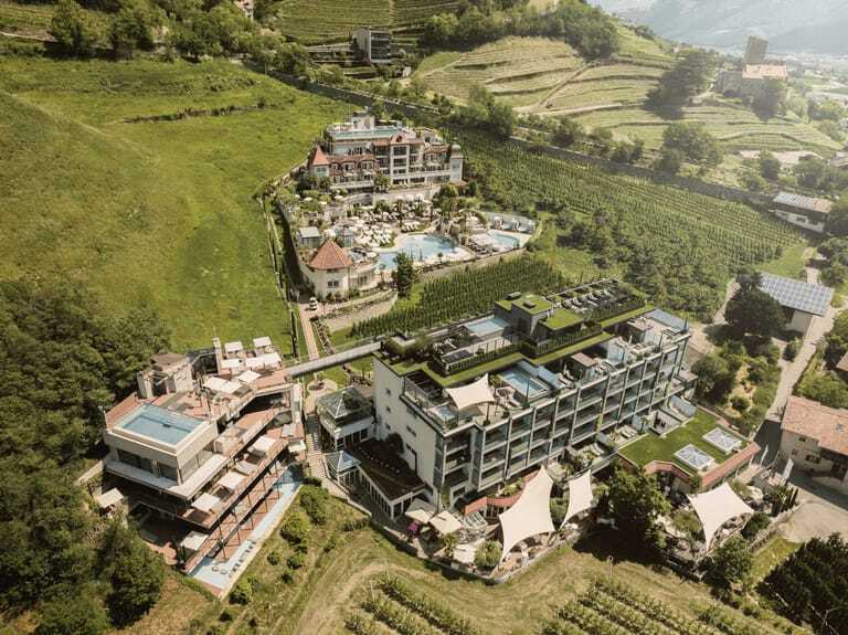 Das Resort vereint alpinen Luxus auf Fünf-Sterne-Niveau mit herzlicher Gastlichkeit, 4.400 qm großer Wellnessoase und spektakulärem Panoramablick auf Meran.