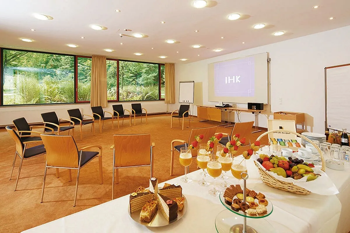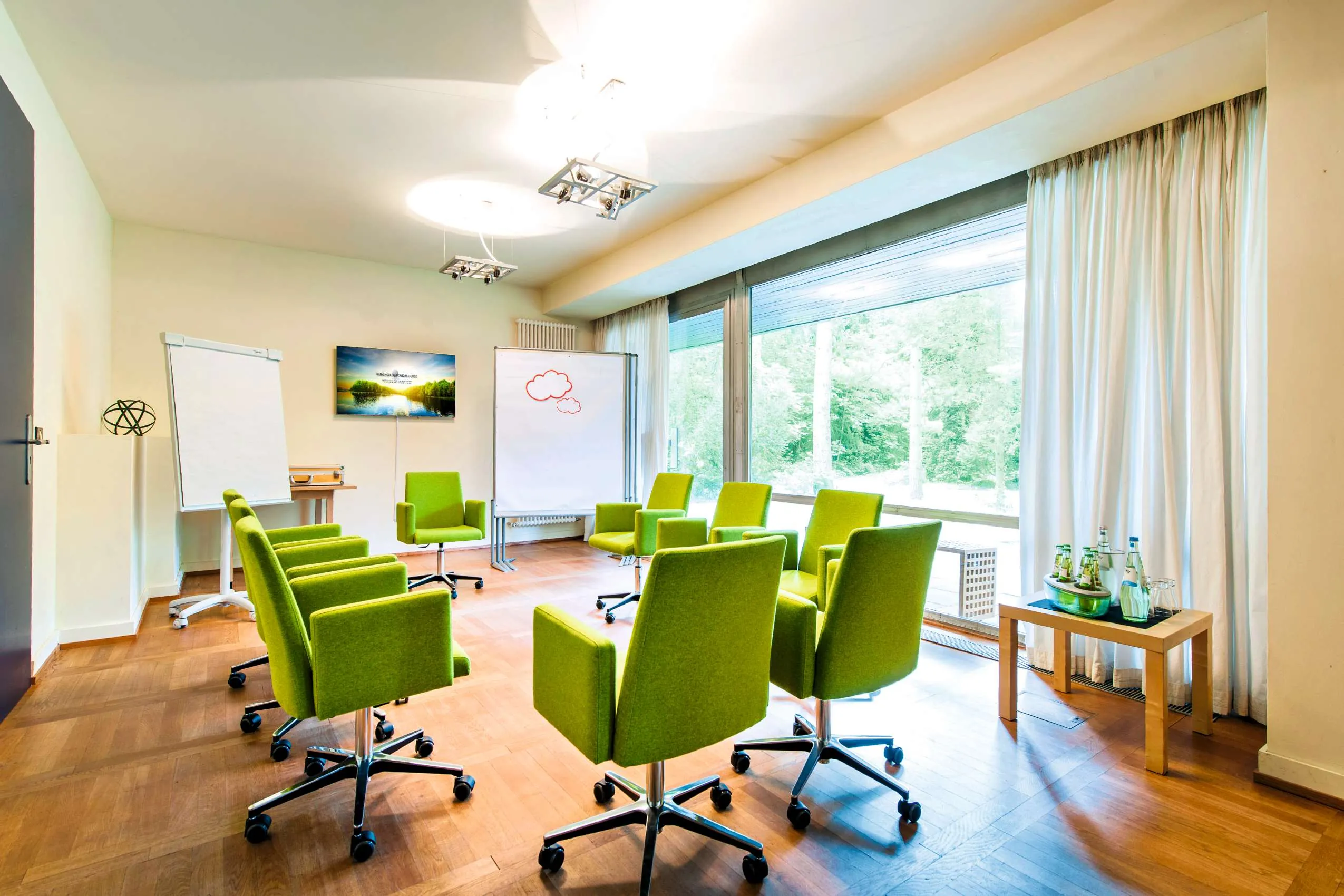 - alle Tagungsräume auf einer Ebene und miteinander kombinierbar, mit gemeinsamem Pausenbereich und Terrasse im Grünen