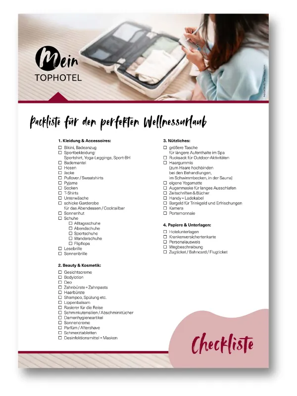 Jetzt zum kostenlosen Mein Tophotel Newsletter anmelden und Packliste für den Wellnessurlaub herunterladen.
