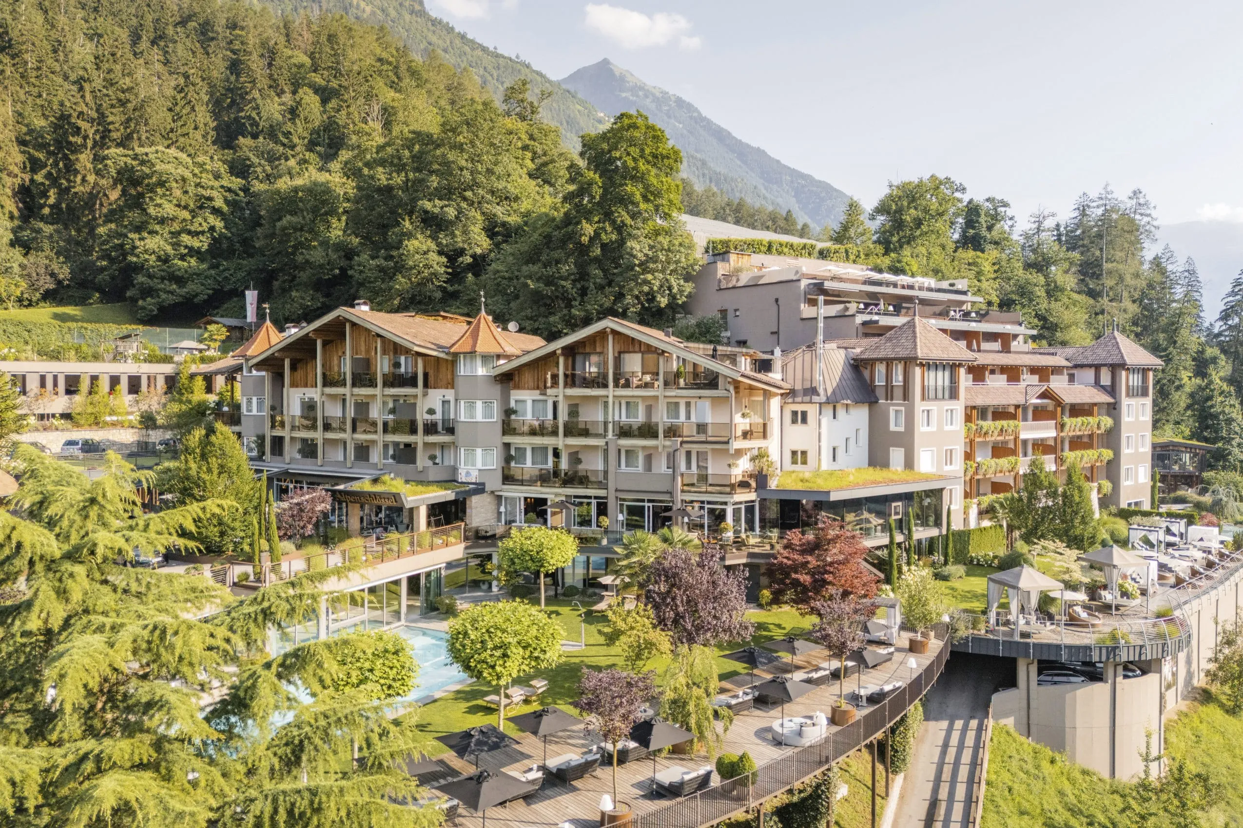 Familiengeführtes Traum-Wellnessresort in Marling in der Nähe von Meran. Das Resort verfügt nicht nur über einen umfangreichen Spabereich mit mehreren Pools, sondern eignet sich auch für Outdoorerlebnisse in der Natur des Meraner Landes.